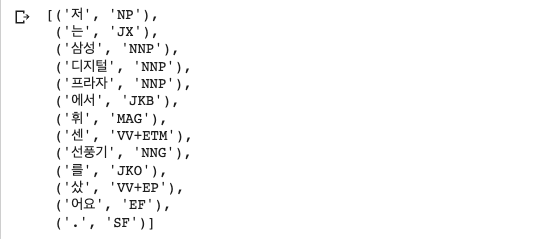 # 6) 해당 품사가 조사, 어미, 구두점이면 제외하고 append 로 인덱스 0번 값만 다시 리스트에 담아줍니다.