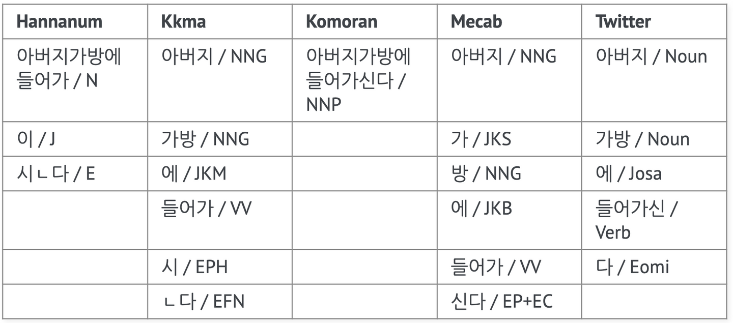 형태소 분석기마다 품사를 태깅하는 방법이 다 다르다.