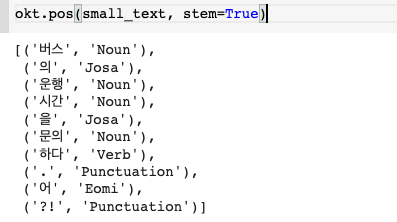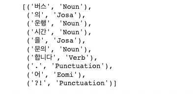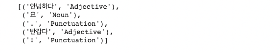 # 2) 품사태깅을 합니다. [('문의', 'Noun'), ('하다', 'Verb'), ('?!', 'Punctuation')]