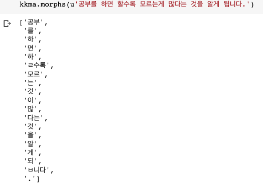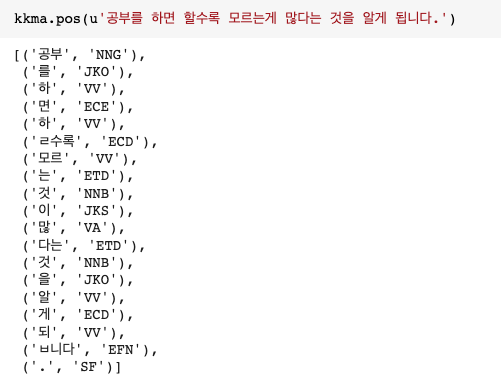 kkma.pos(u'공부를 하면 할수록 모르는게 많다는 것을 알게 됩니다.')
