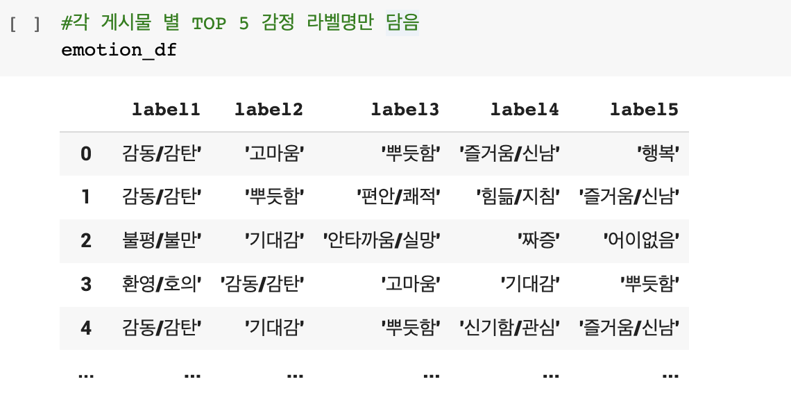 이런 데이터셋에서 '감동/감탄' 등 텍스트만 뽑기 위한 전처리